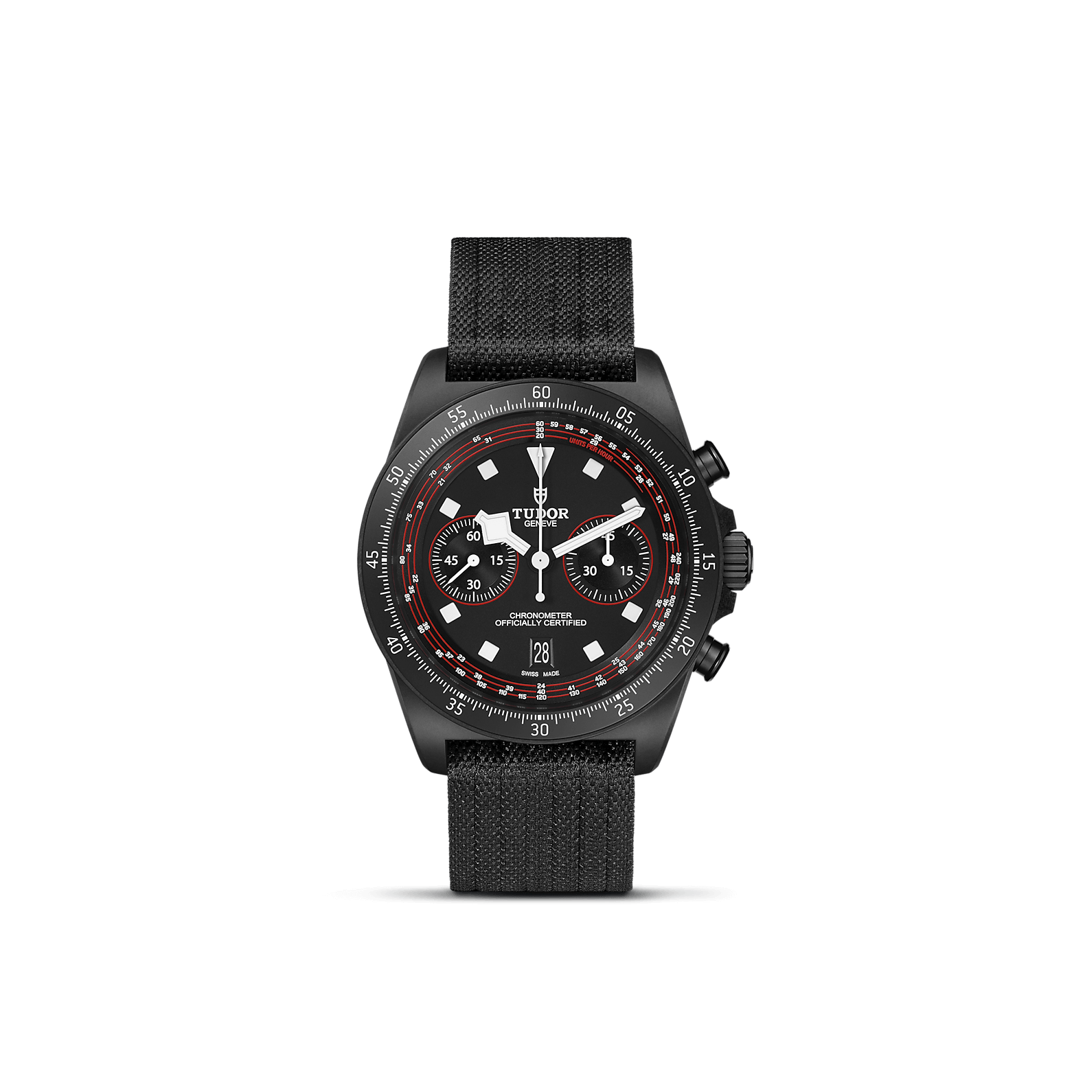 Dial: Black, matt, red accents on the chronograph counters and tachymeter scale