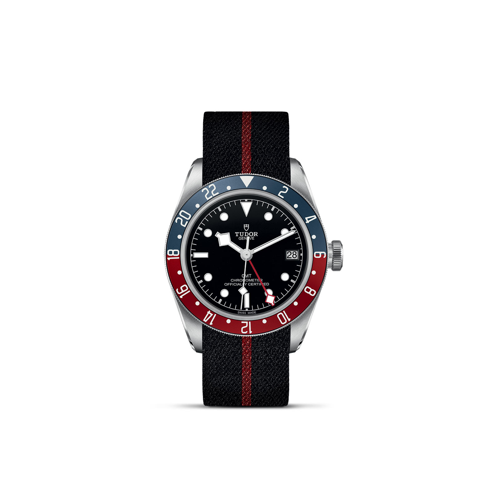 Bezel: Bidirectional rotatable 48 notches bezel in steel with 24-hour graduated anodised aluminium disc in matt burgundy and blue