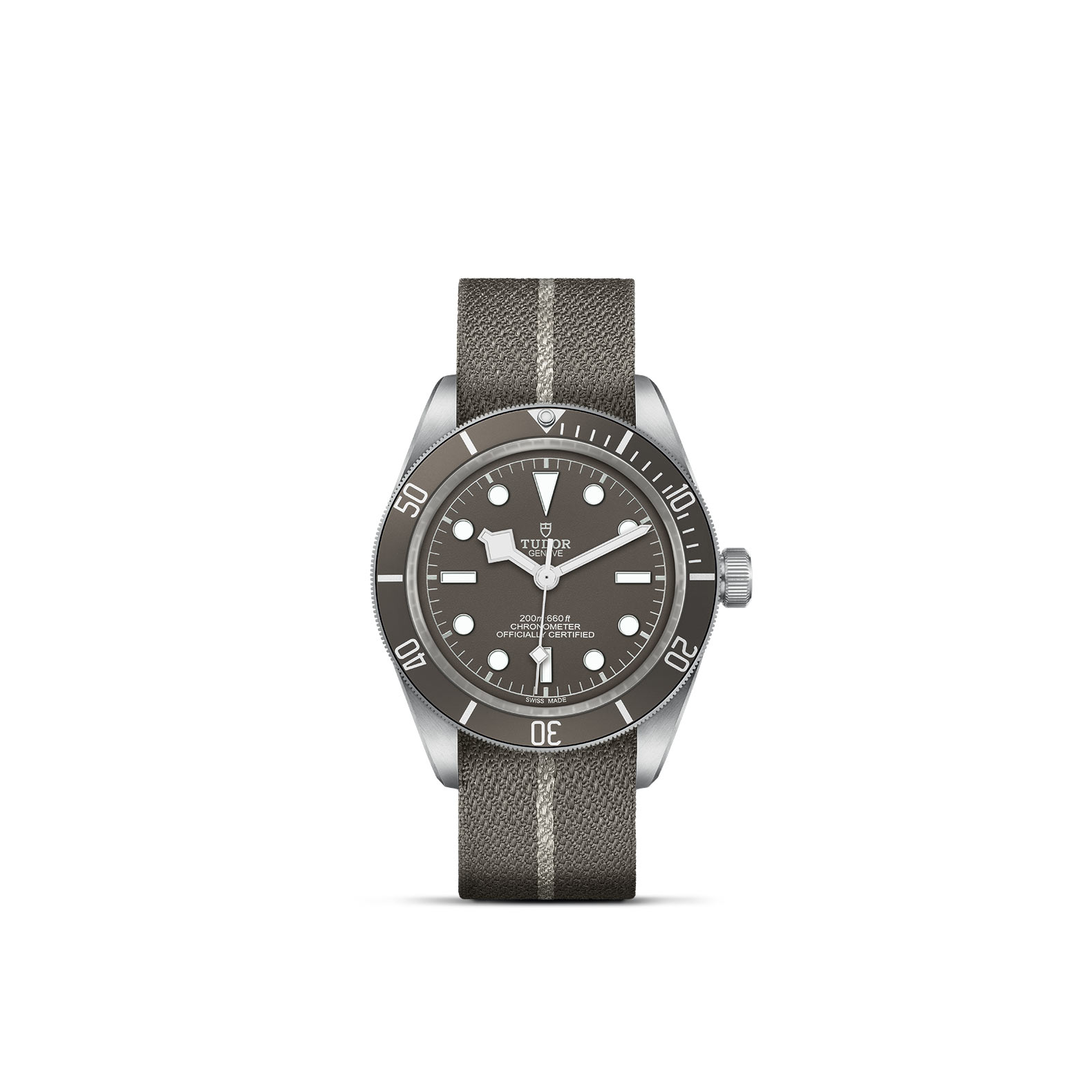 Description: 39 mm silver case, Taupe fabric strap